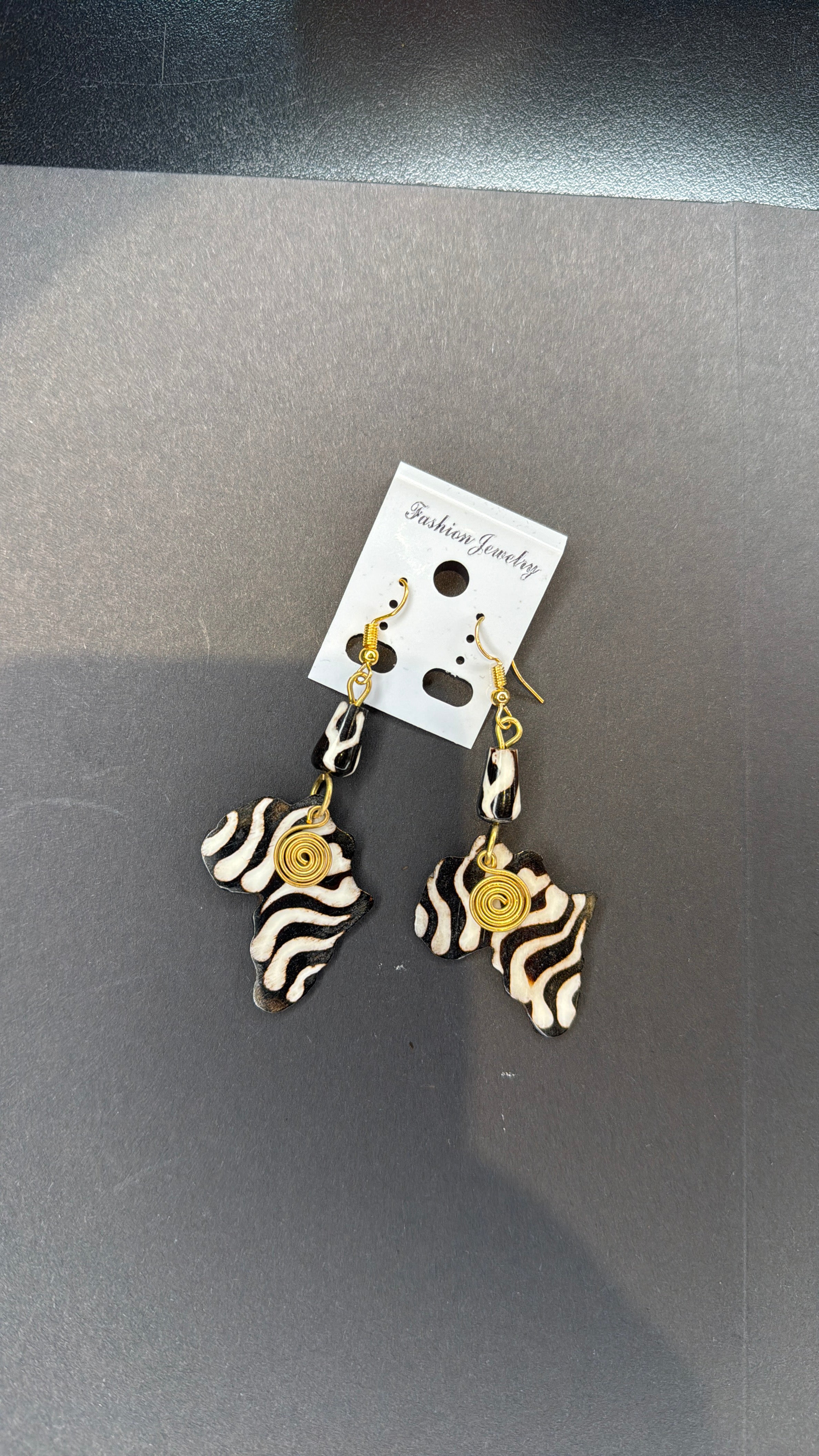 Celebrate African heritage and style with these unique Africa Map Earrings. Each earring features a charm shaped like the continent of Africa, adorned with a bold black and white zebra print pattern. A striking gold-toned spiral wire accent is artistically placed on the surface, adding a touch of rustic elegance. The charm is suspended from a gold-toned hook, with a coordinating zebra-striped bead adding to the design. These lightweight earrings are a powerful statement piece, perfect for anyone who wants to showcase their love for unique, culturally inspired, and exclusive jewelry.