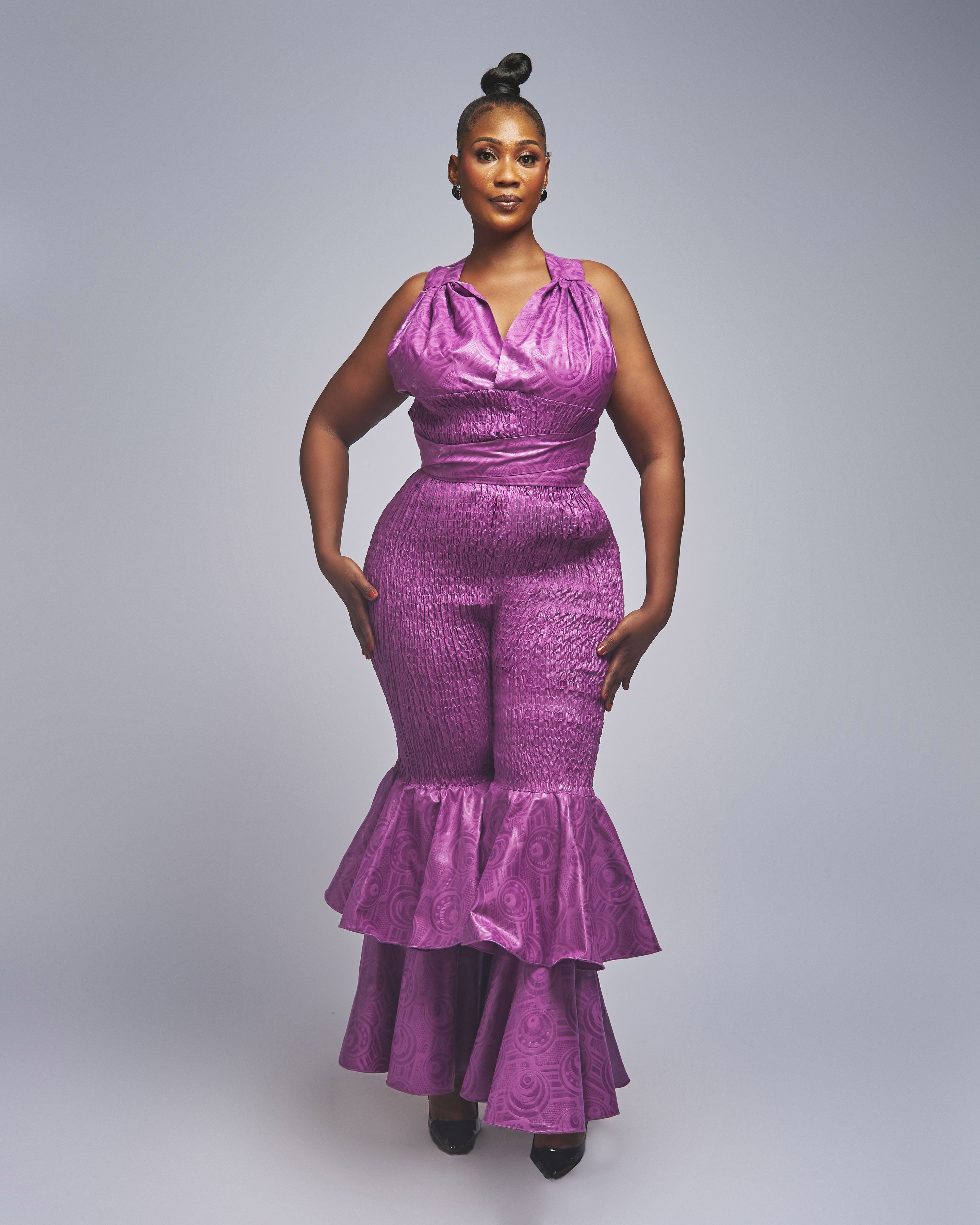Step into bold elegance with our Double Bell Cross-Tie Jumpsuit, a radiant masterpiece made to turn heads. Bathed in a striking colors, this jumpsuit brings sunshine to any room, while playful purple and blue circular patches add a splash of artistic contrast. The long tie neckline exudes confidence and femininity, and the ramp-style silhouette flows effortlessly with every step—perfect for fashion runways, celebrations, or standout moments.