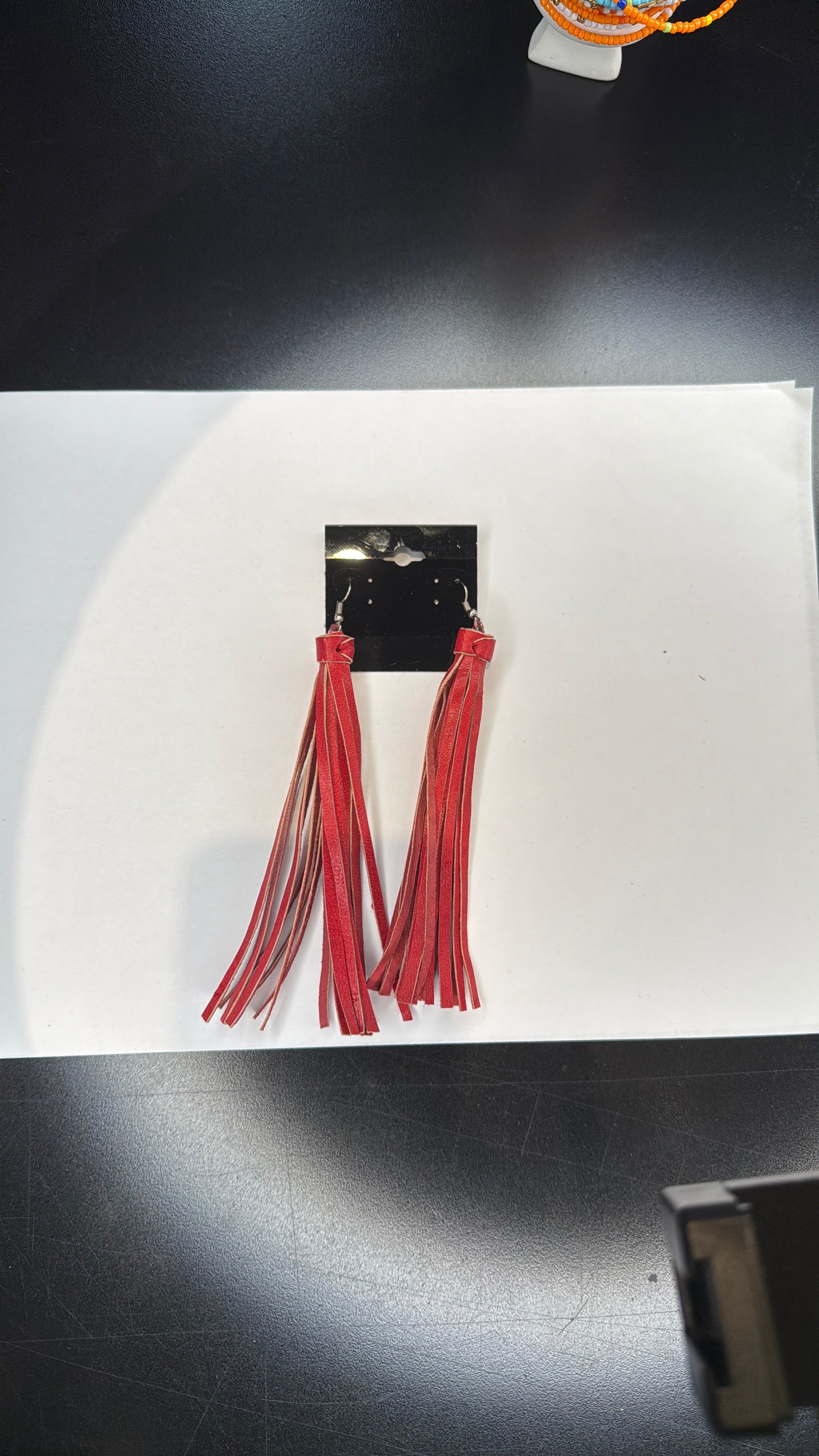 Make a bold statement with these dramatic Long Red Leather Tassel Earrings. Each earring features a cascade of thin, supple red leather strands that create a full and striking tassel. The tassels are lightweight and move beautifully with you, adding a dynamic and playful element to your look. The vibrant red color ensures these earrings will stand out, making them the perfect accessory to add a pop of color to any outfit. Suspended from a simple hook, these earrings are comfortable for all-day wear and are a must-have for anyone who loves exclusive, fashion-forward accessories.
