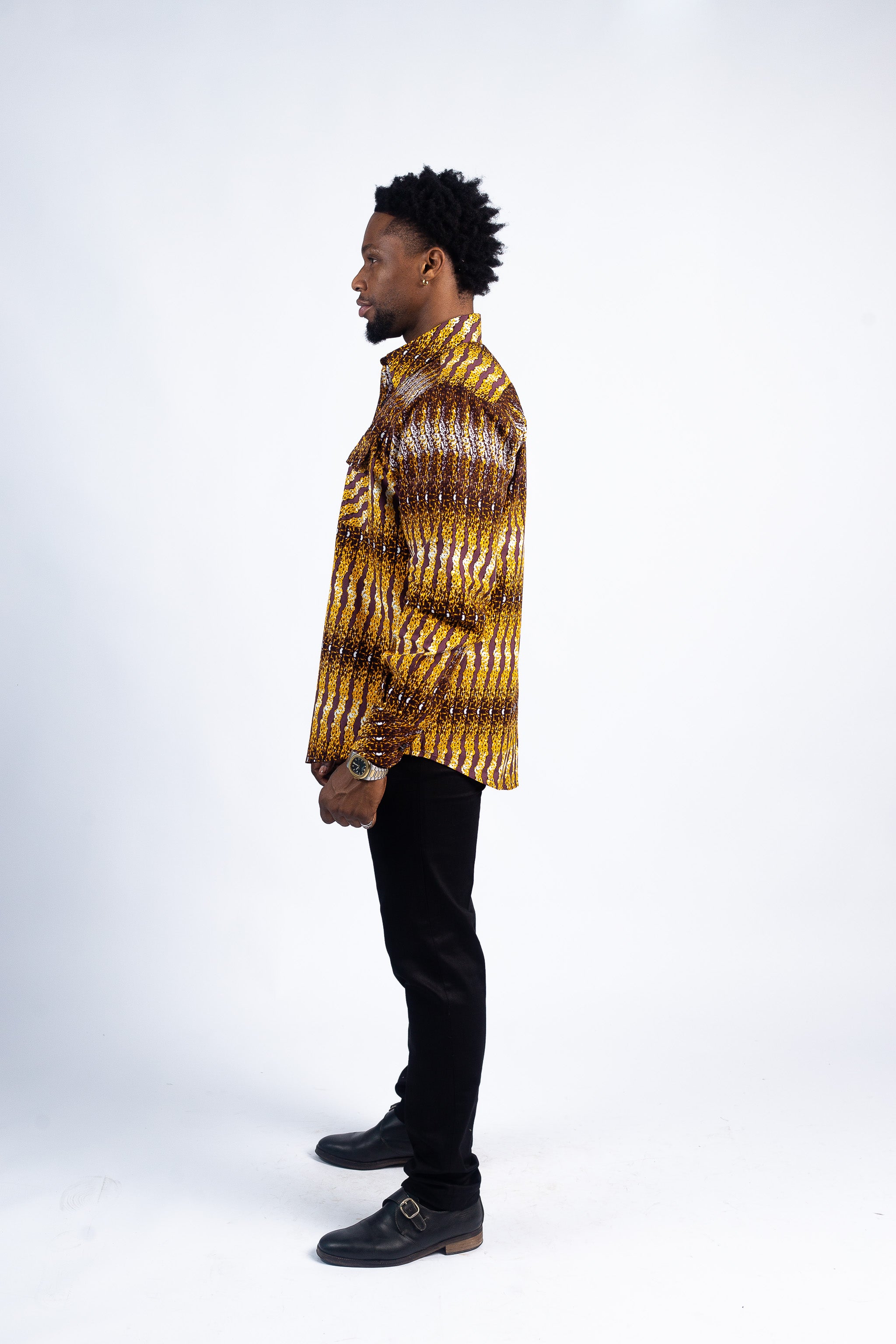 Infuse your wardrobe with rich, earthy tones and a captivating design with this golden and brown abstract striped long-sleeve shirt. Made from 100% premium, breathable cotton, this shirt offers exceptional comfort and a sophisticated visual appeal. The dynamic interplay of golden hues and deep brown vertical stripes creates a textured and artistic look, perfect for adding warmth and unique character to your casual or smart-casual outfits.