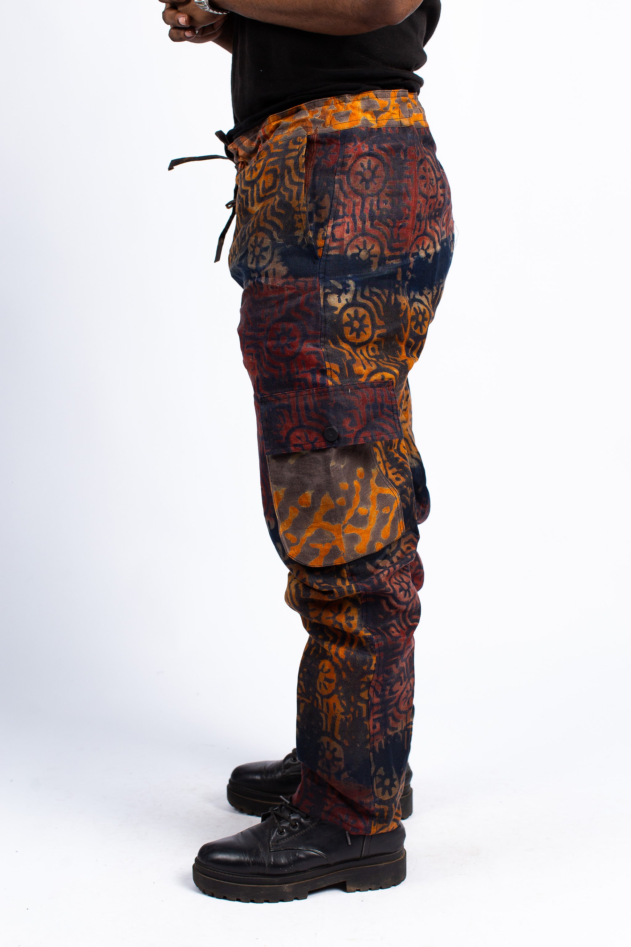 Step out in bold, artistic style with these unique hand-dyed batik print cargo pants. Each pair boasts an intricate pattern and rich, earthy tones, ensuring no two are exactly alike. Designed for comfort and versatility, they feature practical cargo pockets and a relaxed fit, making them perfect for expressive everyday wear or special occasions.