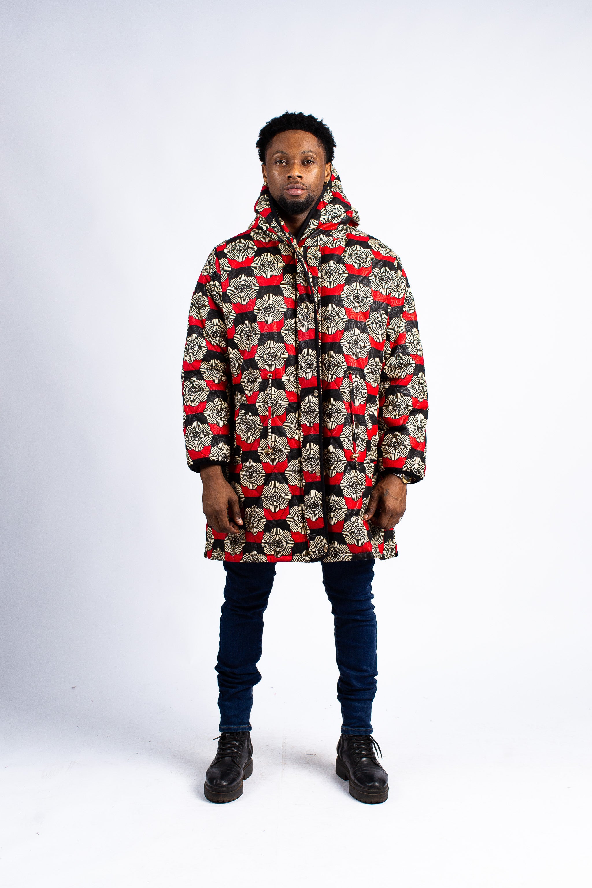 Brave the elements in bold, distinctive style with this hooded parka featuring an eye-catching floral wax print. Combining traditional African patterns with a modern silhouette, this coat is designed to make a statement while providing warmth and comfort. Its unique design ensures you'll stand out in any crowd, perfect for those who appreciate both fashion and cultural artistry.