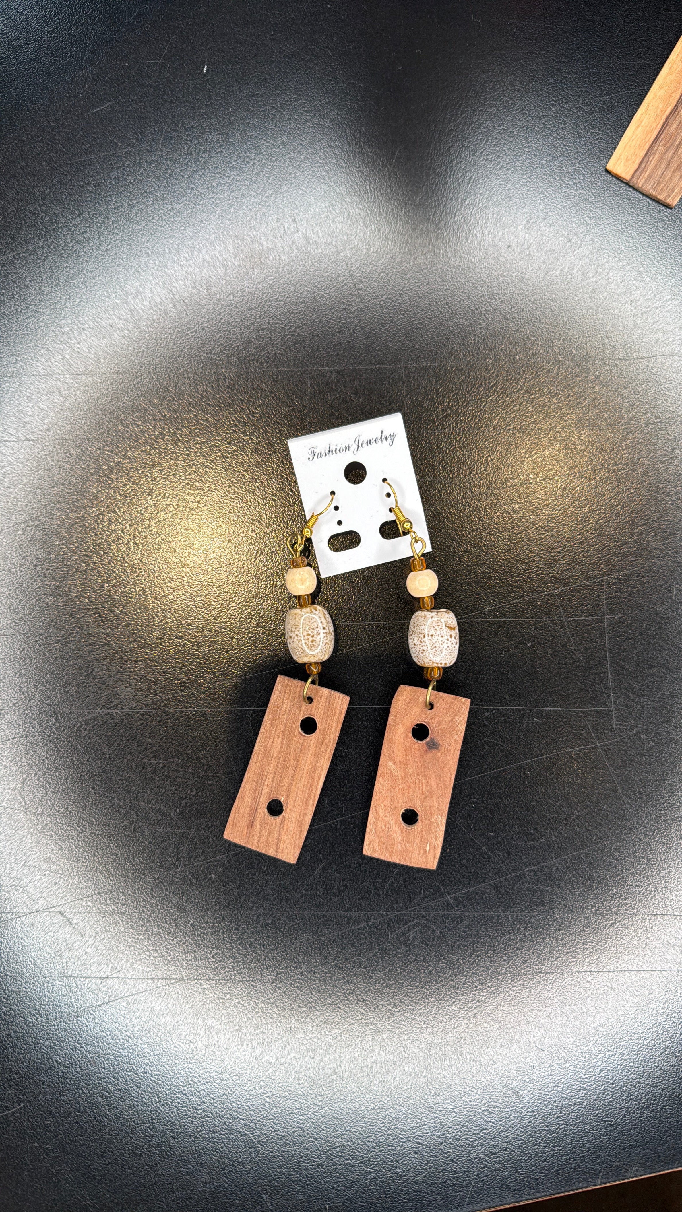 Embrace a rustic and earthy aesthetic with these unique Mixed Bead and Wood Block Dangle Earrings. Each earring features a geometric rectangular charm crafted from a light-colored wood with a beautiful, natural grain. The charm is suspended from a series of beads, including a round wooden bead and a textured, cream-colored bead with intricate patterns, creating a sophisticated and multi-textured look. The combination of natural materials and geometric shapes gives these earrings a distinctive bohemian flair. Lightweight and comfortable for all-day wear, these exclusive earrings are the perfect accessory for adding an artistic, natural touch to any outfit.