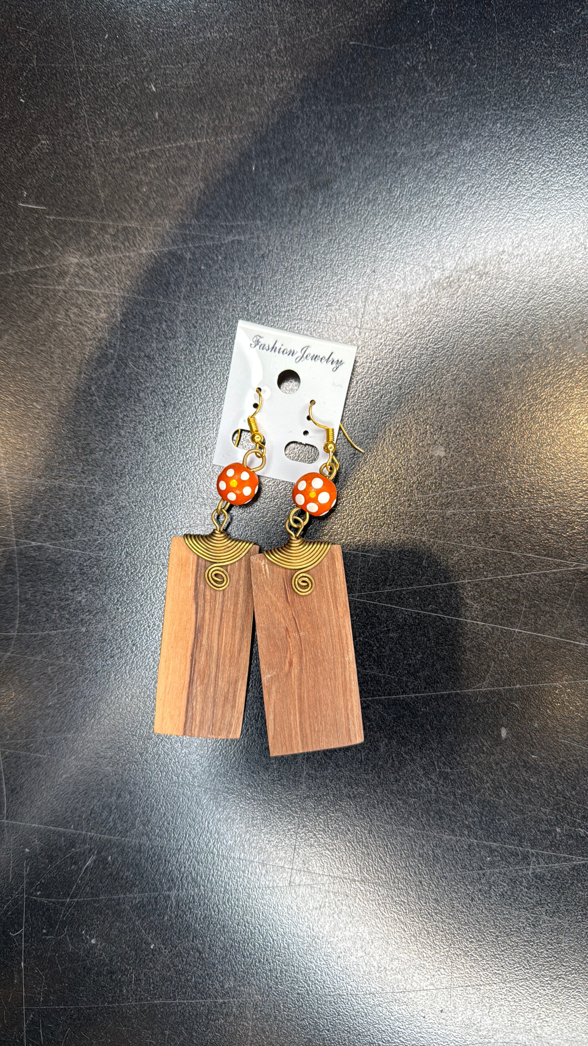 Infuse your style with a playful and earthy vibe with these unique Polka Dot and Wooden Rectangle Dangle Earrings. Each earring features a geometric rectangular charm crafted from a light, natural wood, highlighting the beautiful grain. The charm is suspended from a vibrant, orange-toned bead with white polka dots, creating a fun and eye-catching contrast. A small gold-toned spiral wire accent adds a touch of rustic charm. These lightweight earrings are perfect for adding a touch of exclusive, artistic flair to any outfit, from casual wear to a chic evening look.