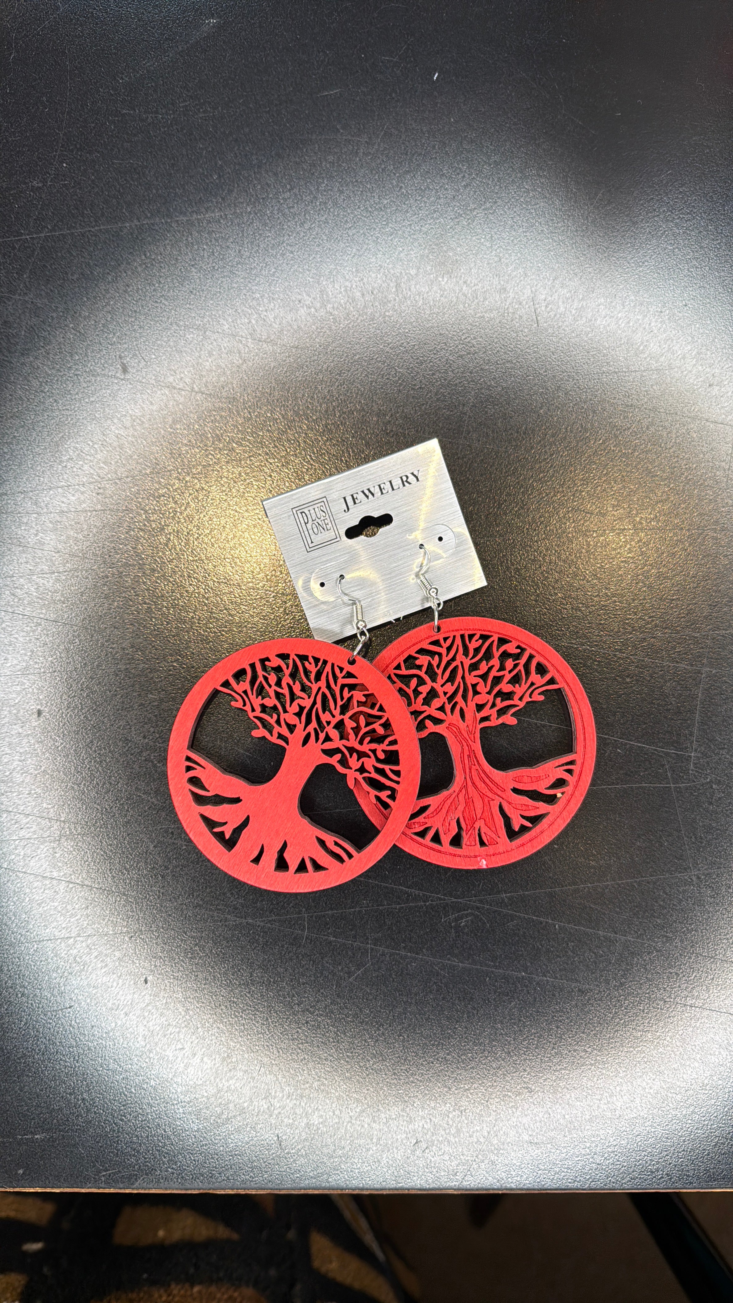 Embrace the beauty of nature and symbolism with these striking Red Tree of Life Wooden Earrings. Each earring features a beautifully intricate cut-out design of the Tree of Life, a powerful symbol of connection, growth, and strength. The vibrant red color gives a bold and modern twist to the classic design. These large, lightweight wooden earrings are perfect for making a bold yet comfortable statement. Suspended from a simple silver-toned hook, they are an exclusive and meaningful addition to any jewelry collection, ideal for those who appreciate both natural beauty and spiritual symbolism.