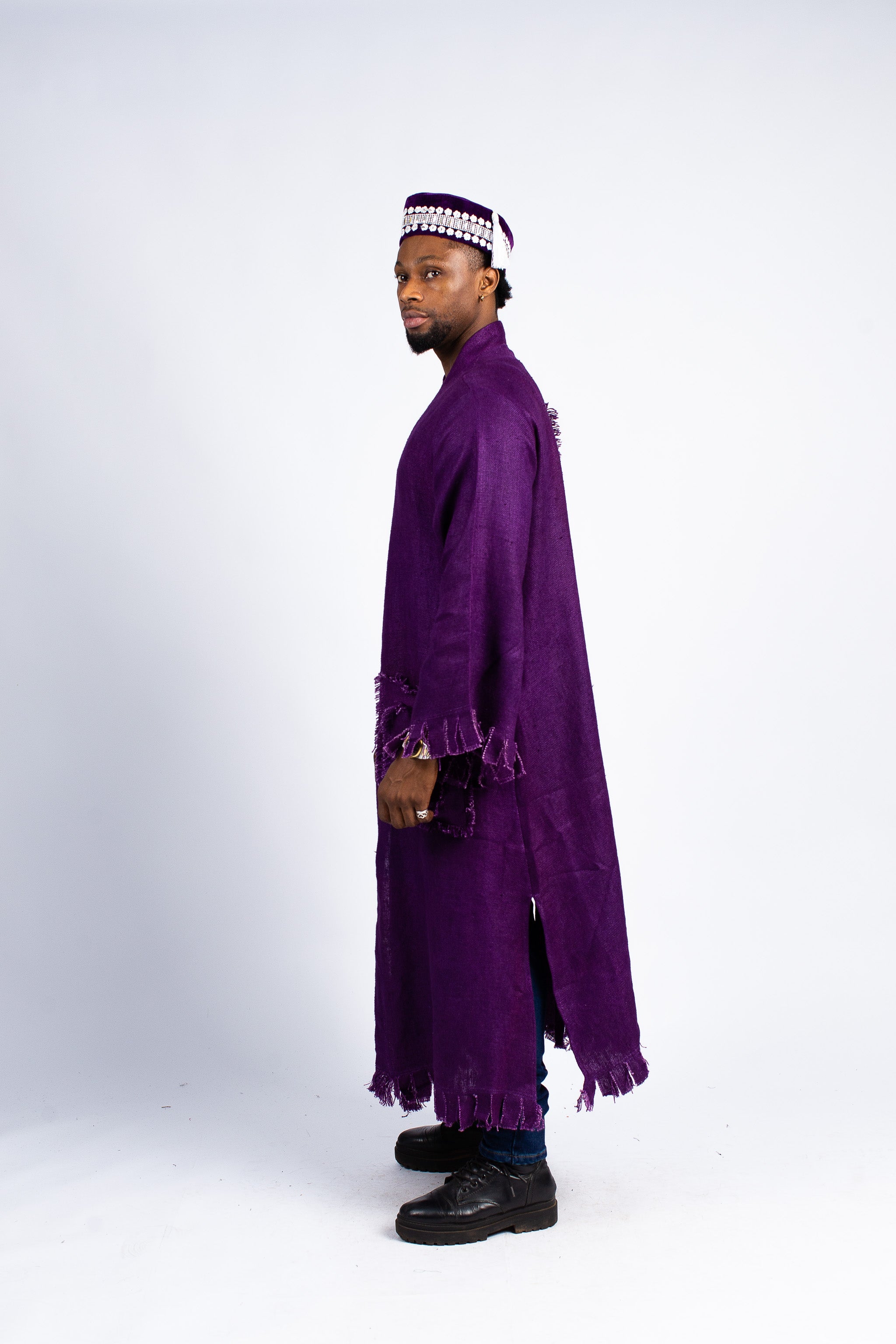 Exude majestic elegance with this striking royal purple kimono robe, crafted from a beautifully textured fabric and featuring stylish raw, fringed edges on the sleeves, hem, and pockets. Paired with a matching beaded cap, this ensemble offers a complete look of refined cultural sophistication. Perfect for making a distinguished statement at any special occasion or adding a touch of regal artistry to your wardrobe.