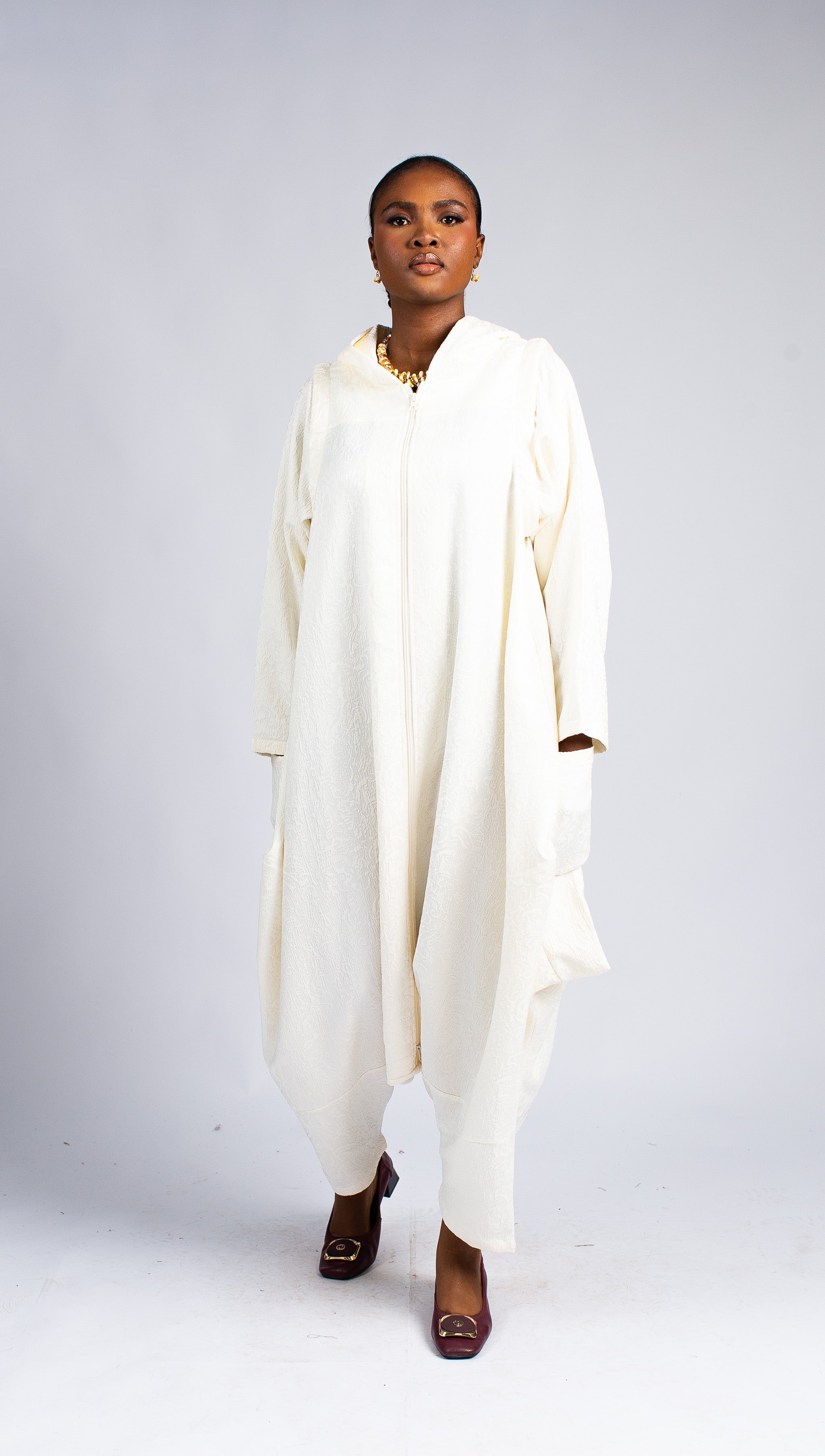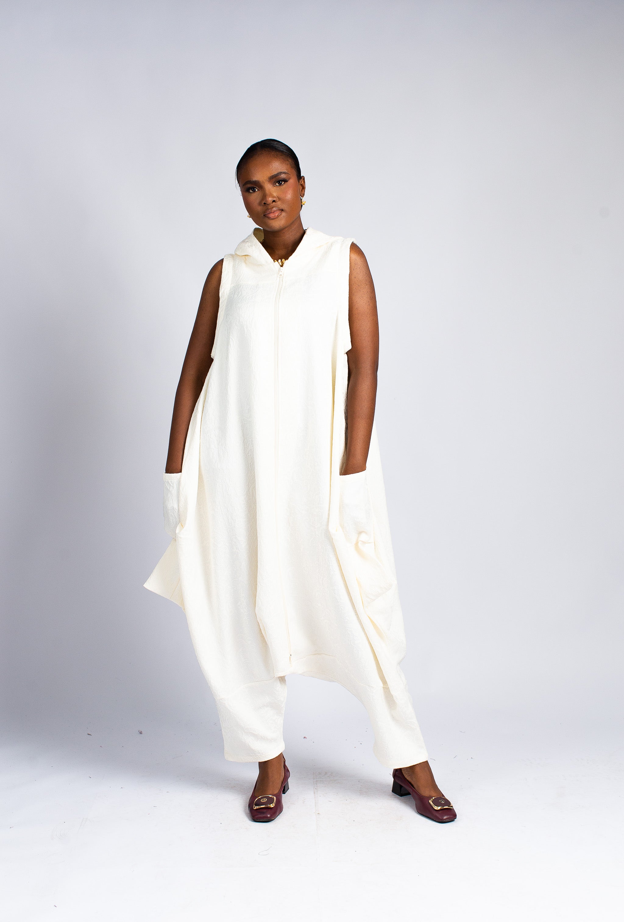 Make a fresh and striking statement in this pristine white hooded harem jumpsuit. This contemporary piece combines a full front zipper for easy wear, a casual hood, and a fashion-forward dropped-crotch harem silhouette. The fabric has a subtle, elegant texture that enhances its pristine appearance, offering a luxurious feel. Perfect for warm-weather events, resort wear, or simply adding a touch of crisp, modern elegance to your wardrobe.