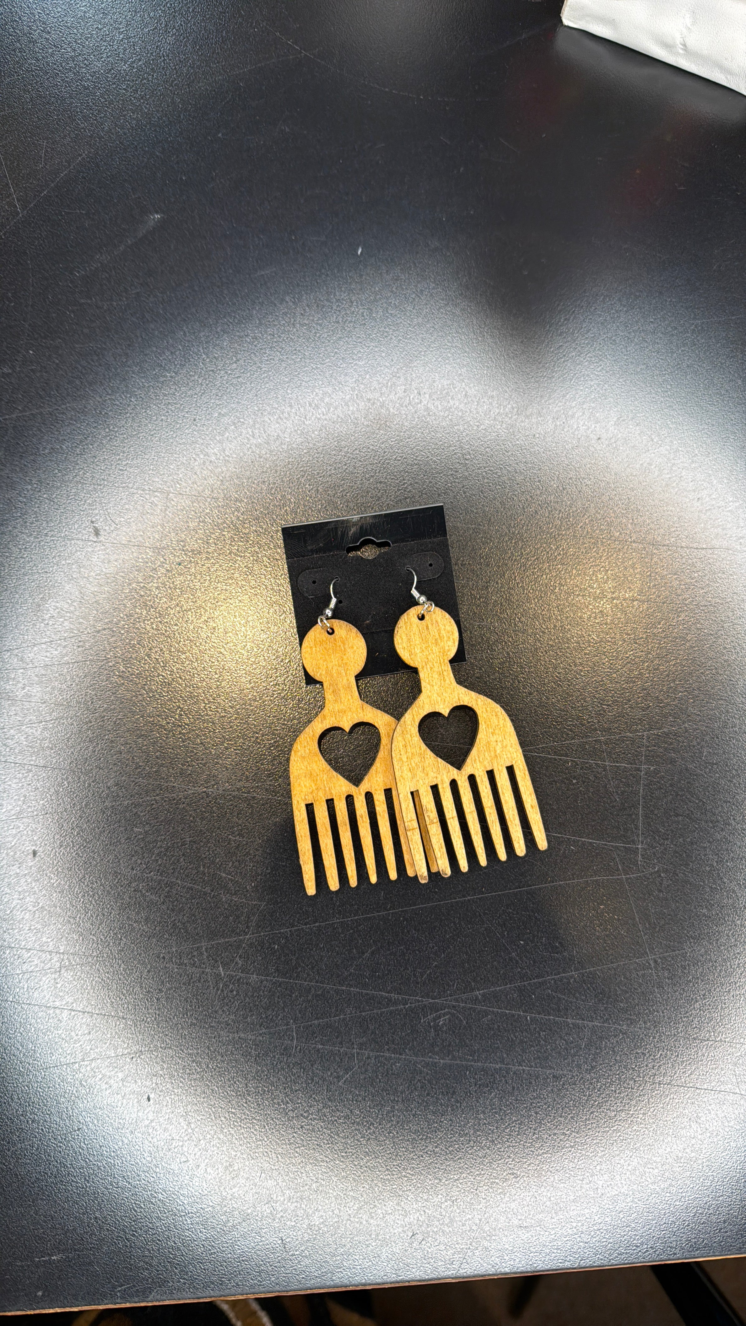 Celebrate natural hair and self-love with these unique Wooden Afro Pick with Heart Cutout Earrings. Each earring features a stylized afro pick design, crafted from a light, natural wood. The top of the pick is shaped like a silhouette of a head, with a heart cut out in the center, symbolizing love and pride. These lightweight dangle earrings are a powerful statement of cultural identity and personal style. Suspended from a simple hook, they are comfortable for all-day wear and are an ideal exclusive accessory for those who appreciate meaningful and artistic jewelry.