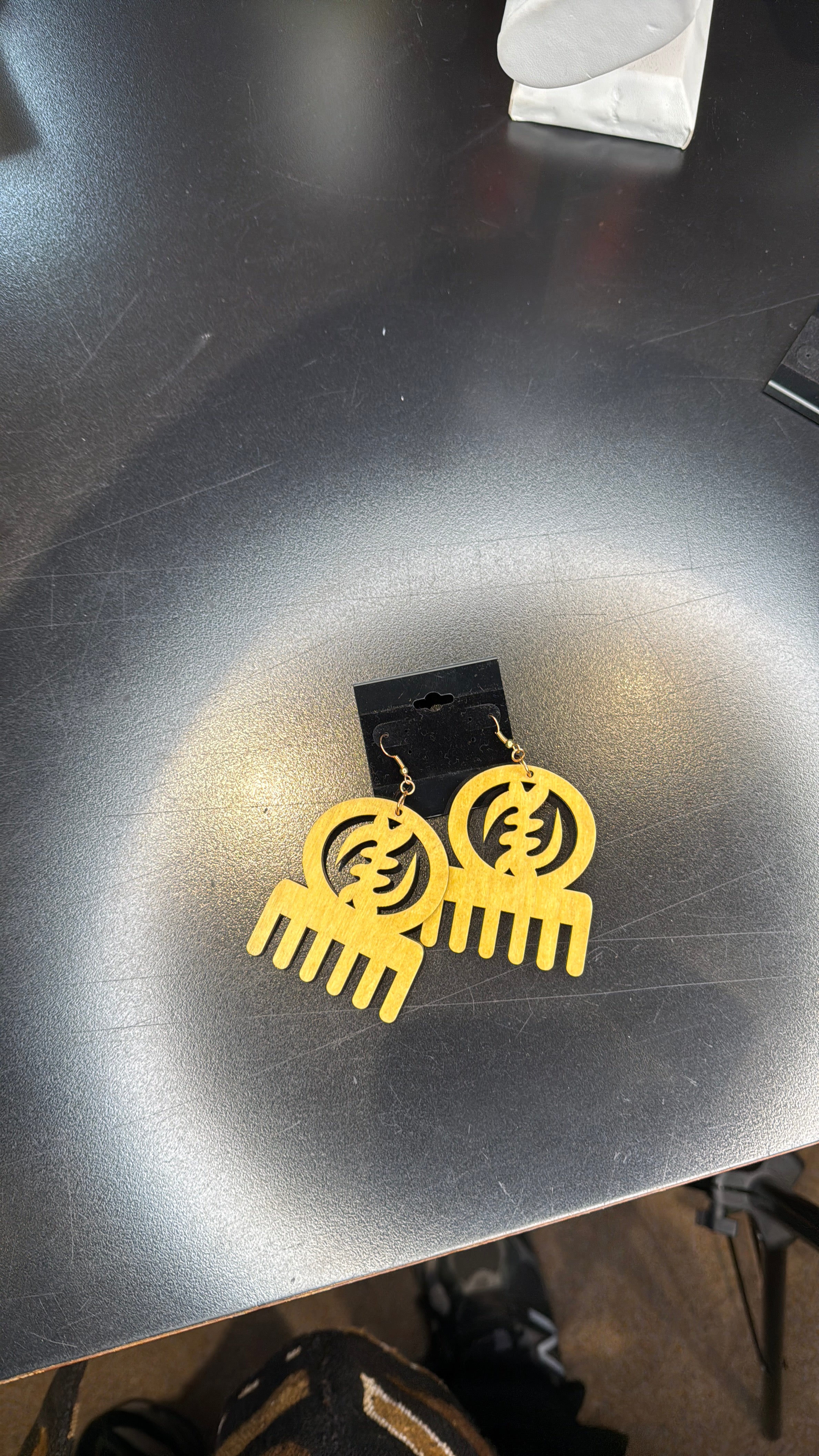 Embrace cultural symbolism with these unique Yellow Sankofa Comb Wooden Earrings. Each earring features a striking design that combines the Sankofa symbol (representing the wisdom of learning from the past) with a traditional comb shape, crafted from a vibrant yellow wood. The intricate cut-out design adds a touch of artistic detail and meaning. These lightweight dangle earrings are a powerful statement of heritage and style, perfect for adding a bold and exclusive touch to your jewelry collection. Suspended from a simple hook, they are comfortable for all-day wear and are an ideal accessory for those who appreciate unique, culturally-inspired designs.